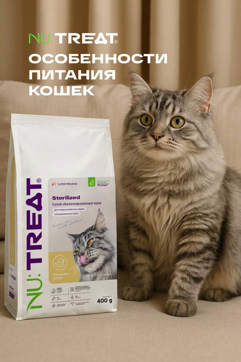 🐾 Правильное питание — залог здоровья вашей кошки! 🐾 Вы когда-нибудь задумывались, почему кошки так тянутся к мясу? Всё просто: они — облигатные хищники! Это значит, что основу их рациона должны составлять животные белки. Аминокислоты из мяса — строительный материал для организма вашего хвостика. Но важно не переборщить: избыток белка может нагрузить почки. Поэтому баланс — ключ к здоровью. Именно такой подход реализован в кормах Nu:Treat. Правильное соотношение белков, жиров и углеводов, качественные источники мяса и полезные добавки. 🌾 Цельнозерновые злаки и клетчатка поддерживают работу ЖКТ,