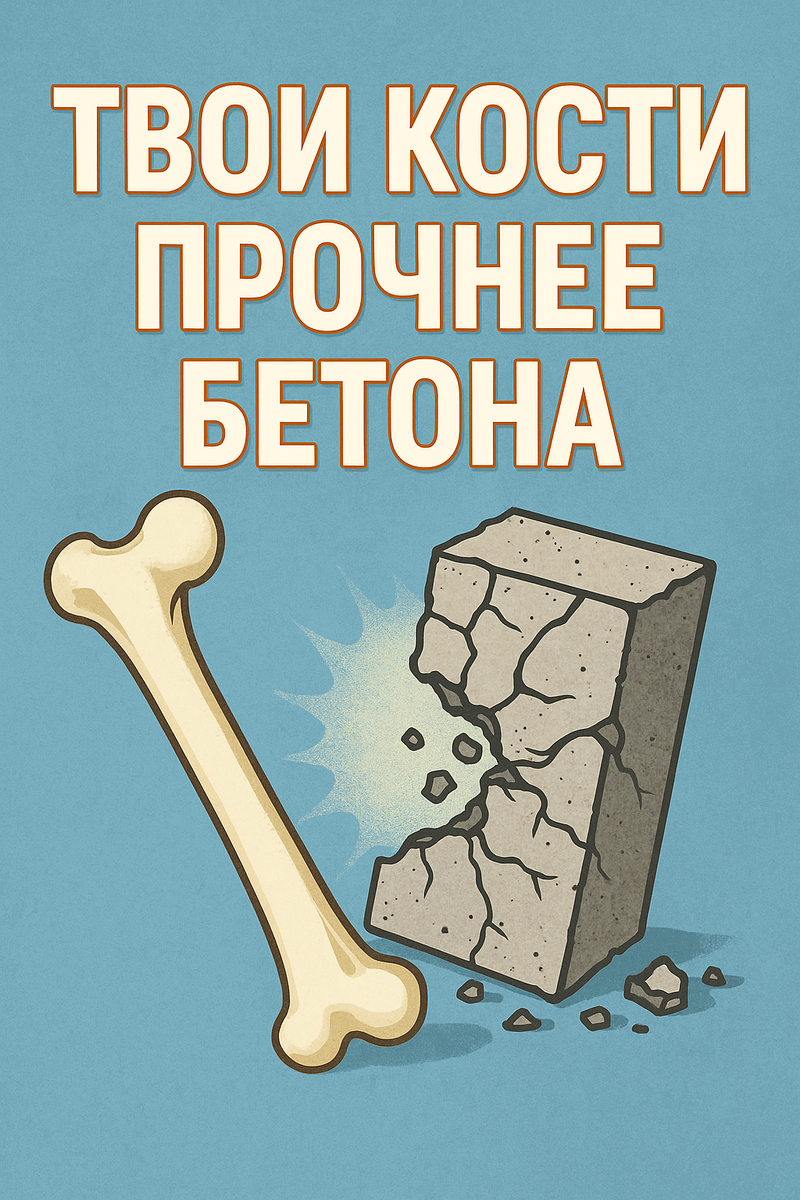 Представь себе бетон — символ прочности и надёжности. Из него строят мосты, дома и небоскрёбы. А теперь удивись: твои собственные кости ещё прочнее! Да, те самые кости, которые ты считаешь хрупкими и уязвимыми, на самом деле — один из самых прочных материалов, которые когда-либо создавала природа. Кость человека примерно в пять раз прочнее бетона при одинаковом весе. Если взять одинаковые по толщине куски кости и бетона, то кость выдержит гораздо большую нагрузку, прежде чем сломаться. Секрет такой прочности — в уникальной структуре. Кость состоит из минералов (кальций и фосфор), которые придают твёрдость, и коллагена, который обеспечивает гибкость. Именно это сочетание делает кости одновременно твёрдыми и устойчивыми к ударам. В отличие от бетона, кости — живой орган. Они постоянно обновляются: старые клетки заменяются новыми. Этот процесс называется ремоделированием, и он позволяет костям восстанавливаться даже после серьёзных травм. Кости способны немного изгибаться, поглощая энерги