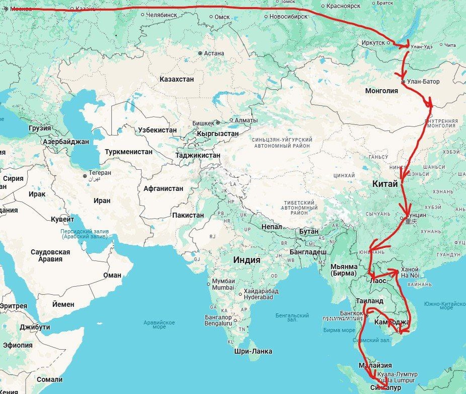 Ура! Наше путешествие к самой южной точке Азии — мысу Пиай — начинается! Из всех моих поездок и тревел-планов это выходит самым эпичным: 45 дней, 9 стран (из них 8 новых), 30 регионов, 34 города! Изначальный план был — проехать из дома до финальной точки наземным транспортом. Однако сначала решили сократить первые четыре дня и вместо поезда «Россия» отправиться к границе с Монголией на самолёте. Дальше — больше: в сезон дождей горные дороги между Лаосом и Вьетнамом размыло, и водителя на этот участок не нашлось — добавили перелёт. Потом Камбоджа и Таиланд закрыли наземные переходы, и пришлось добавить ещё один перелёт. А раз уж перелётов и так много, то добавили ещё парочку по Вьетнаму — где оказалось, что перелёт дешевле поезда. В итоге, если учитывать дорогу из дома и обратно — всего 9 перелётов. Из планов: 🇲🇳 Монголия: увидеть летний фестиваль Наадам. 🇨🇳 Китай: Внутренняя Монголия, многоуровневый Чунцин и изучение горячих источников. 🇱🇦 Лаос: древний Луангпхабанг и купание