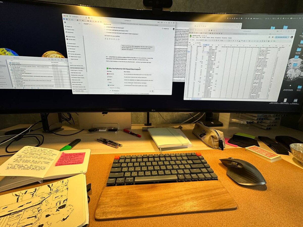 ## Человек с машиной вместе могут гораздо больше, чем каждый по отдельности ### Зачем мне учить Python На самом деле оказалось, что существует прикладная задача, которую я планирую решить с помощью изучения Пайтона, а именно — анализ данных. На ближайший год я запланировал обширное исследование эффекта от использования ручки с бумагой и цифровых гаджетов на познавательные способности человека. Впереди ждёт огромное количество чисел, таблиц, сравнений, расчётов значимости результатов. Да, кто-то скажет, что уже существуют удобные программы, позволяющие сделать всё это нажатием пары кнопок, но мне не требуется удобство — как раз наоборот, удобство будет не удобно. Не удобно в том смысле, что мне интересно разобраться не только в том, как соотносятся цифры, но и понять на «программном» уровне, что я могу сделать с помощью нескольких строк кода. Размышляя над этим и читая всякое, я решил попробовать поговорить с GPT. У меня как раз были данные моего опроса с достаточно большой выборко