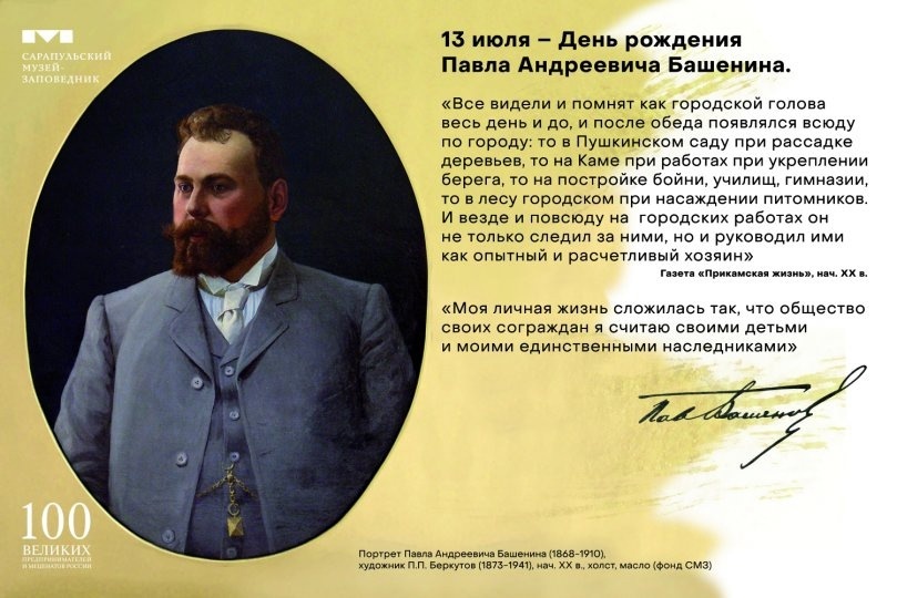 💫 Уважаемые жители и гости города Сарапула, дорогие друзья! ✨ Сегодня, 13 июля, мы отмечаем 157 лет со дня рождения Павла Башенина – выдающегося деятеля, купца 1-й гильдии, городского головы Сарапула (1904–1910) и Почетного гражданина города. Его имя навсегда вписано в историю Сарапула. 🙌🏻 Этот день для нас – не просто повод вспомнить заслуги Павла Андреевича, но и возможность выразить благодарность потомкам рода Башениных и всем, кто сохраняет память о великом земляке. Мы говорим спасибо сотрудникам Сарапульского музея, архивистам и исследователям за их труд, благодаря которому имя Павла Андреевича остается живым и значимым для горожан и гостей нашего города. 🖼 С 1995 года в загородном доме Башенина работает уникальный художественно-выставочный комплекс – «Дача Башенина», ставший, без преувеличения, символом Сарапула и всей Удмуртии. Сегодня музей привлекает не только традиционными экскурсиями, но и новыми формами работы: театрализованными встречами, музыкальными и театральным