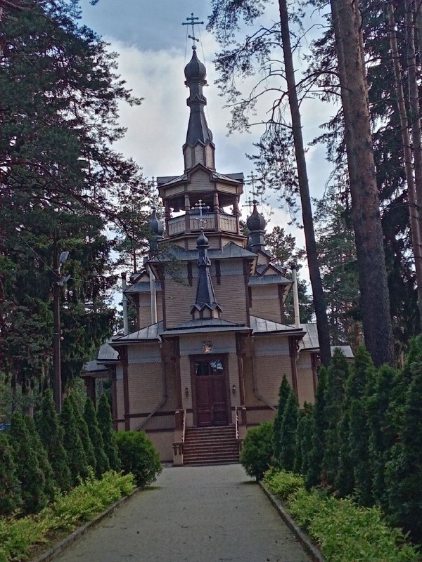Первая остановка была в поселке Песочный у храма Преподобного Серафима Саровского. Бывшее название поселка, являвшегося типичным дачным, – Графская. Здесь пытались создать единство природы и архитектуры, активно применяли стиль модерн. Храм является образцом церковной архитектуры начала двадцатого века, отразившим переход от русского стиля к модерну. Что уже любопытно! Контраст больших и маленьких объемов создает запоминающийся яркий образ. При храме действует сестричество, помогающее онкобольным.