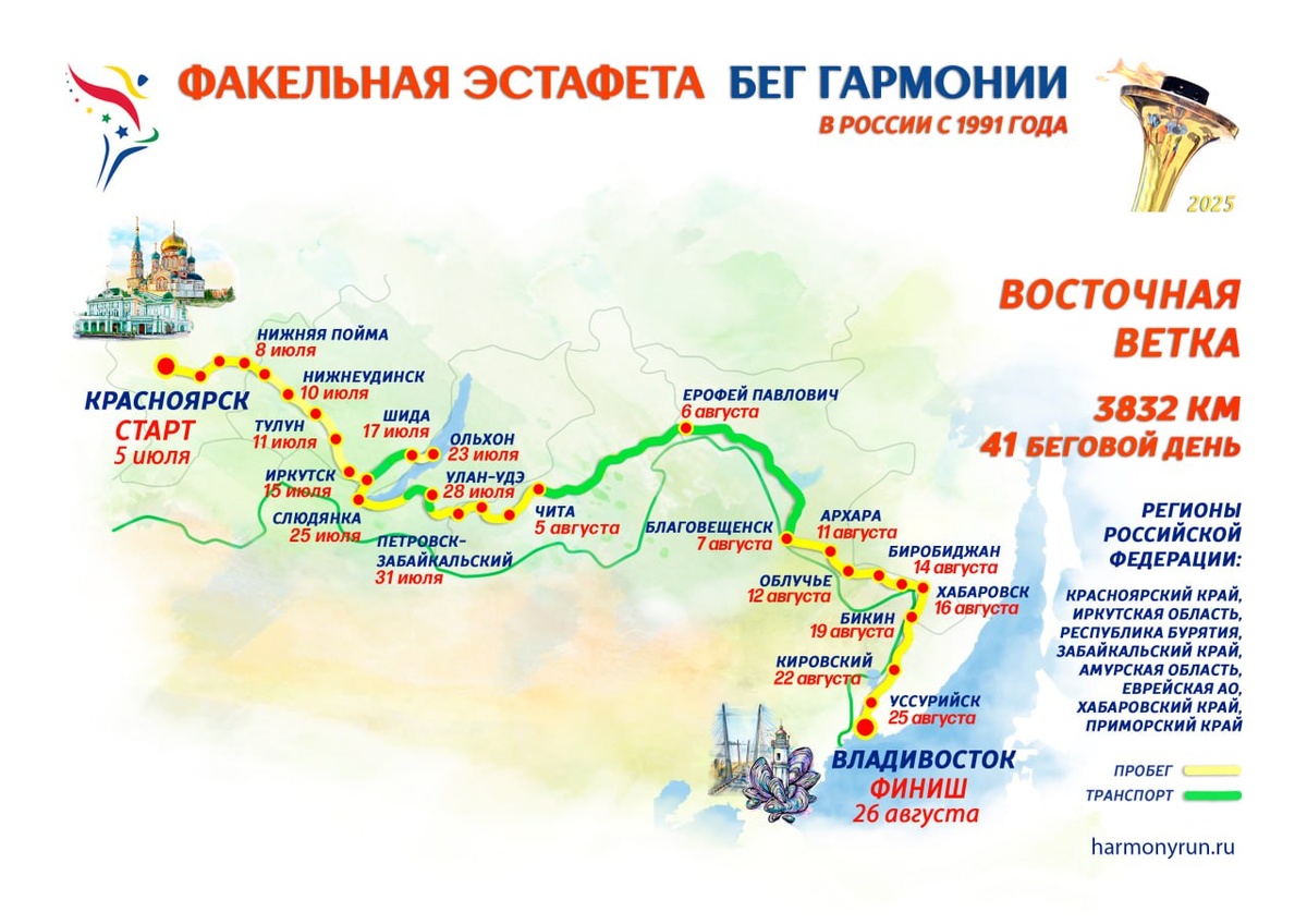 ЕАО примет этап факельной эстафеты «Бег Гармонии» 14 августа Первый пробег стартовал в 1991 году. В 2025 году запланировано проведение "Бега Гармонии" по территории 19 регионов Российской Федерации. Длина маршрутов всех веток по территории европейской части России и Сибири составит около 7000 км. Восточная ветка эстафеты (3832 км, 41 беговой день) стартовала 5 июля в Красноярске. Маршрут проложен по территории Иркутской области, Республики Бурятия, Забайкалья, Амурской области, ЕАО, Хабаровского края, Приморья. Финиш состоится во Владивостоке 26 августа. В Биробиджане участников эстафеты ждут 14 августа. Основные участники пробега — энтузиасты спорта, как профессиональные спортсмены, так и любители. Основная цель проекта — приобщение граждан к занятиям физической культуры и спортом, а также установление культурных и дружеских связей между людьми разных регионов нашей страны Подпишись @РИА Биробиджан