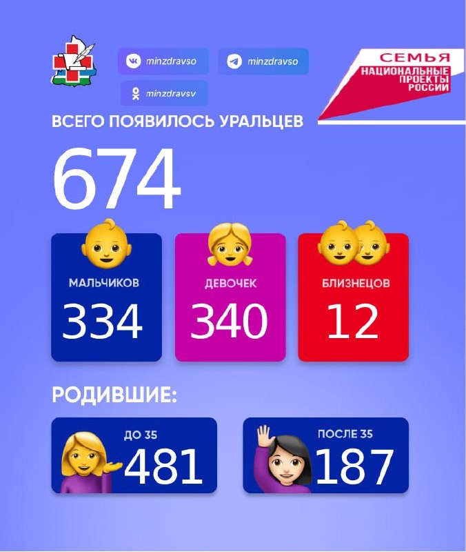 Радостной статистики пост! 🤱За прошедшую неделю в Свердловской области на свет появились 674 малыша: 💙334 мальчика и 340 девочек💖, из них 6 пар близнецов 481 мама родила до 35 лет. 187 мамочек родили после 35 лет. 👨👩👧👦 Для двух свердловчанок это были восьмые по счету роды, а 52 новорожденных стали четвертми детьми у своих мам.🏅 Поздравляем! 📱Подписаться, чтобы узнать больше