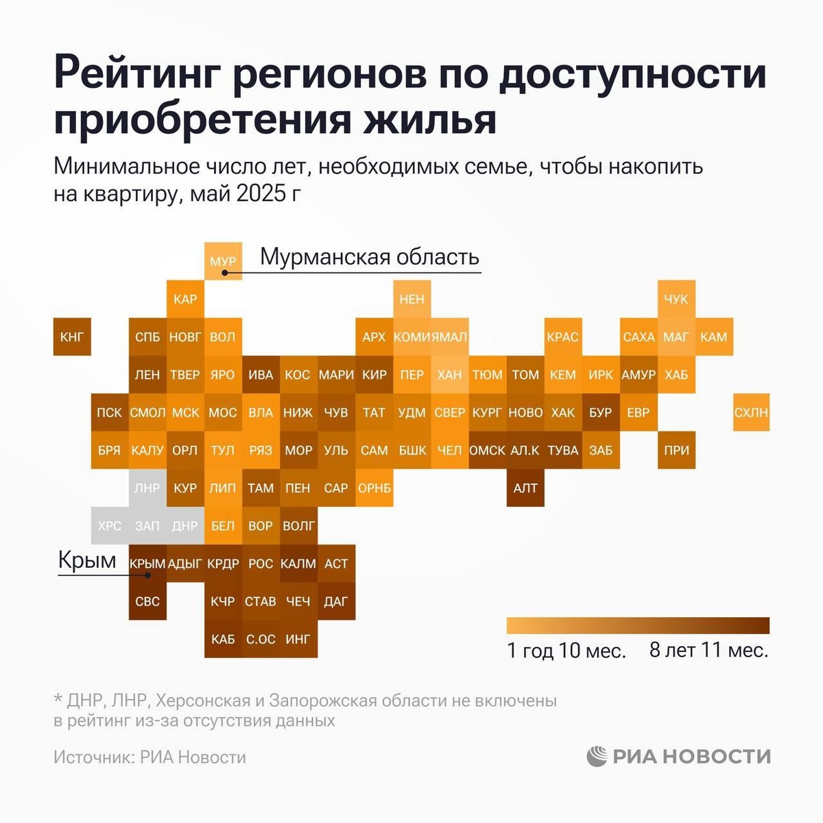 Мурманская область, Ханты-Мансийский и Ненецкий автономные округа лидируют по доступности приобретения жилья. В этих регионах относительно низкие цены на недвижимость, а зарплаты высокие. На нижних строчках рейтинга - Крым, Севастополь и Калмыкия. Жителям этих субъектов придется копить на квартиру свыше 7 лет. @ria