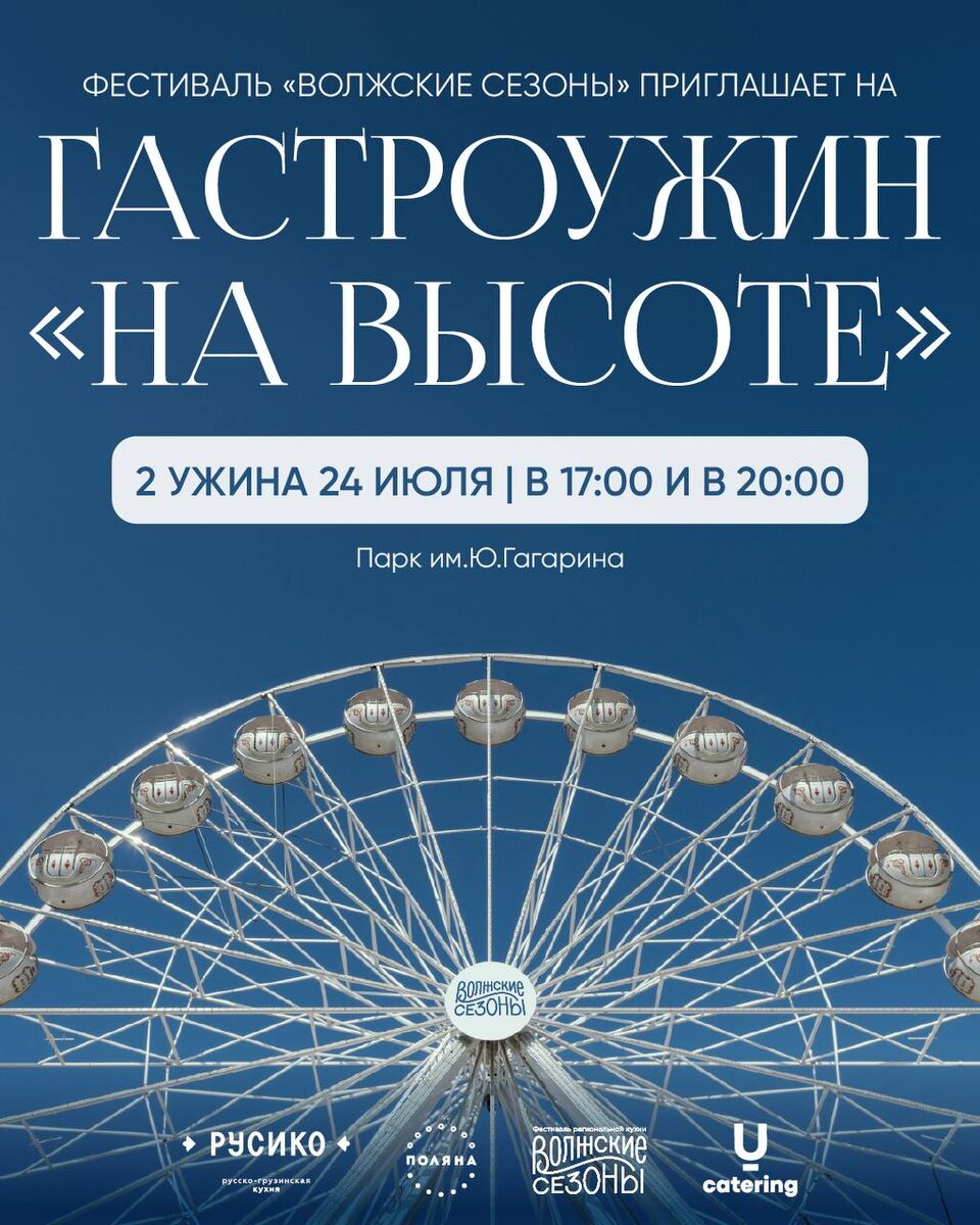 Гастроужин «На высоте» 24 июля в парке имени Ю. Гагарина на колесе обозрения состоятся два незабываемых ужина, объединяющих локальные вкусы и впечатляющие виды города. Бренд-шефы «Ресторанной компании Поляна» Евгений Гурин и Андрей Рогачёв с командой шеф-поваров подадут четыре курса блюд с волжскими специалитетами и местными продуктами: 1. Хлеб на жигулевском пиве с грибным маслом 2. Мозаика из волжской рыбы 3. Утка с полбой,копченой вишней и смородиновым жу. 4. Жигулевское мороженое на ржаной бриоши Ужин будет сопровождаться безалкогольным коктейлем «Купеческий» от шеф-бармена Егора Ширяева. В коктейле отражены местные продукты, которые хочется показать гостям города, — жигулевская вишня и куйбышевское яблоко. Стоимость билетов: В 17:00 «Ранний ужин» – 5000р В 20:00 «Ужин на закате» с эксклюзивной фотосессией и атмосферой вечернего города – 7000р К ужину прилагаются не только изумительные по красоте городские виды с высоты птичьего полёта, но и аудиогид от краеведа Андрея Артём