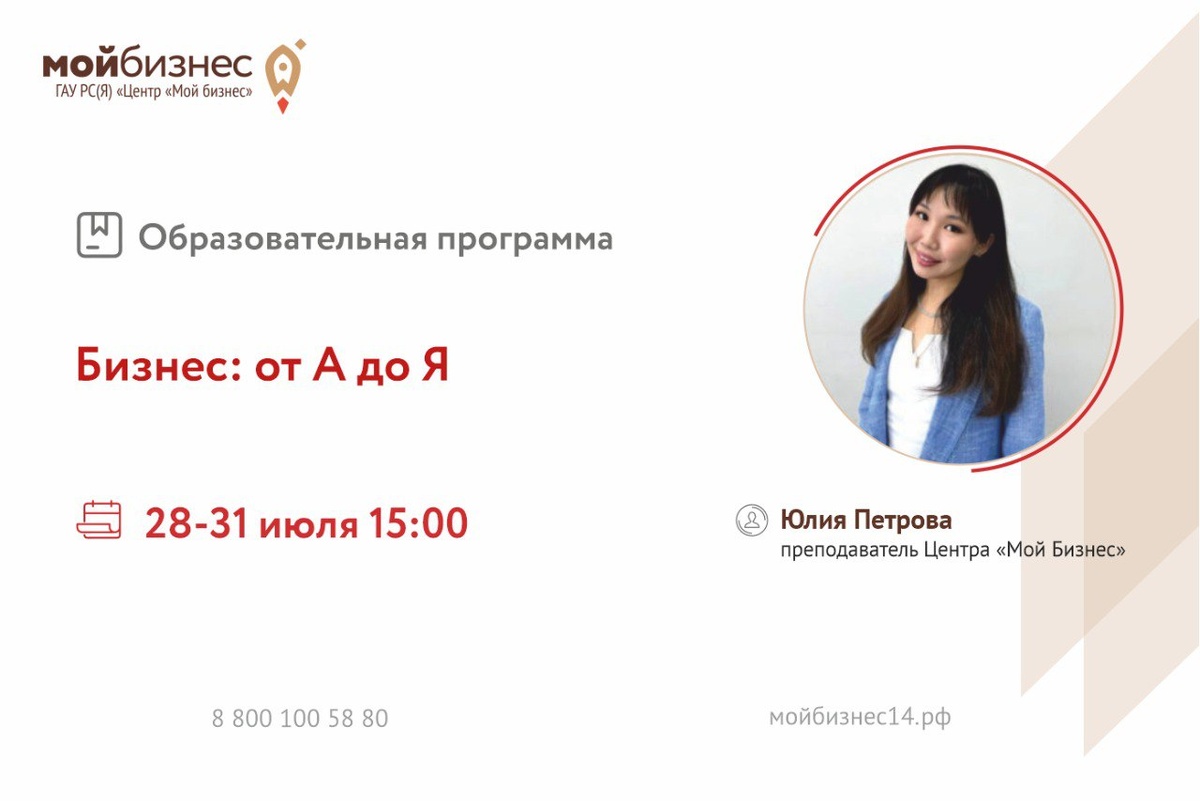 🚀Центр «Мой Бизнес» приглашает принять участие в образовательной программе «Бизнес: от А до Я». 🌟Программа «Бизнес: от А до Я» предназначена для потенциальных и начинающих предпринимателей по обучению навыкам создания бизнеса с нуля. ⚡Участники тренинга получат: - знания в области юридических аспектов, маркетинга, калькуляции, финансового планирования; - методы разработки бизнес-плана; - инструменты анализа; - полезные источники информации для бизнеса. 📆Дата: 28-31 июля 🕟Время: 15:00 ч. 🎙️Спикер: Юлия Петрова, преподаватель Центра «Мой бизнес». ✔️Формат обучения: онлайн ✔️Количество мест ограничено! 📎Ссылка для регистрации @moibizsakha