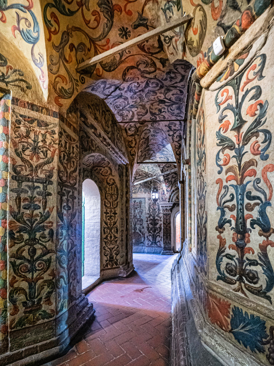 Собор таким был всегда: в 16 веке весь расписан «под кирпич», в 17 веке на стенах распустились пышные цветочные узоры, в 18 и 19 веке поменялись вкусы, и появился новый орнамент. В начале 20 века заново расписали церковь Василия Блаженного и примыкающие к ней помещения первого этажа собора.