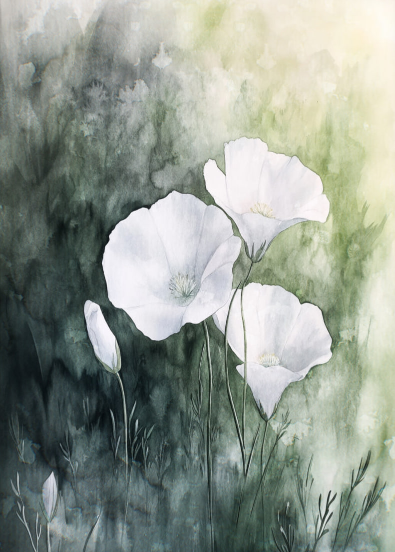 Белые цветы растут в тишине, внутри утреннего света 🌿 Картина будто впитывает зелень фона, где-то чуть темнее, где-то светлее, как будто воздух играет с оттенками. Лепестки полупрозрачные, тонкие, но не хрупкие — держатся спокойно, уверенно. Стебли почти сливаются с фоном, но именно это притягивает взгляд: тени, глубина, мягкий контраст. Каждый бутон выглядит как точка покоя в этом зелёном фоне 🌱 Стили: Акварель, Импрессионизм, Реализм, Модерн, Пейзаж. Автор работы: Светлана Алейникова, Азов, Ростовская область, Россия 🇷🇺 Картина «Цветы в зелёном цвете» Здесь вы можете наслаждаться картинами современных цифровых художников, которых нет в масс-маркете, и которые можно купить на холсте или бумаге 🤍