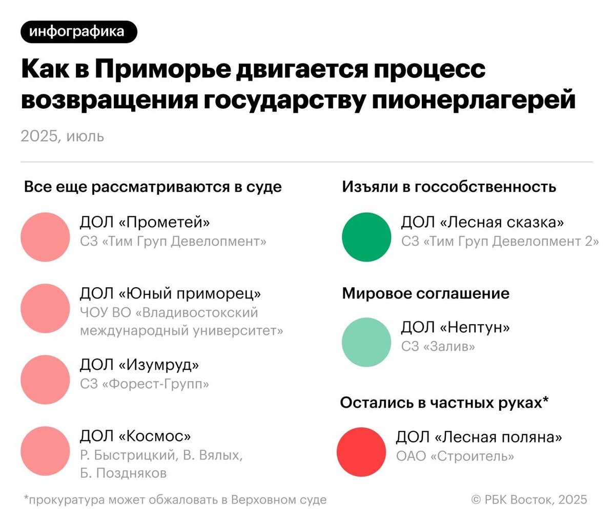 😀😀😀 В Приморье буксует процесс возвращения государству пионерлагерей Как выяснил РБК Восток, за два года прокуратуре удалось передать муниципалитету только один объект из семи – ДОЛ «Лесная сказка». Его забрали у СЗ «Тим Груп Девелопмент 2». По лагерю «Нептун» было достигнуть мировое соглашение. Еще один – ДОЛ «Лесная поляна» – суд постановил оставить в частных руках, прокуратура может обжаловать решение лишь в Верховном суде. Дела остальных – «Изумруд», «Космос», «Прометей» и «Юный приморец» – все еще рассматриваются. В большинстве случаев суды на стороне нынешних собственников лагерей. 😃Подписывайтесь на РБК Восток
