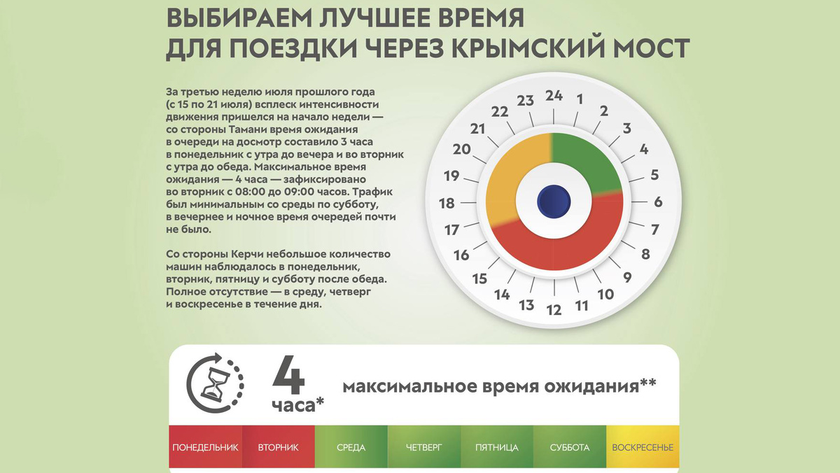 Выбирая период чтобы избежать многочасовых стояний в очередях, есть риск попасть в затор в самое неожиданное для этого время. С началом пика курортного сезона автомобильные заторы перед Крымским мостом образовываются в течение всего дня. И если раньше до восьми утра и после семи вечера подъезды к досмотровым комплексам были свободны, то сегодня, впервые с начала года, пробка началась с двух ночи и уже к шести утра достигла 1400 машин, растянувшись на десяток километров (время ожидания составляло более четырех часов). В вечерние часы вплоть до полуночи также возникают очереди системности в которых нет и поэтому предсказать, когда они появятся невозможно. Оперативные службы Крымского моста сообщают, что досмотровые комплексы с обеих сторон работают с максимальной эффективностью.