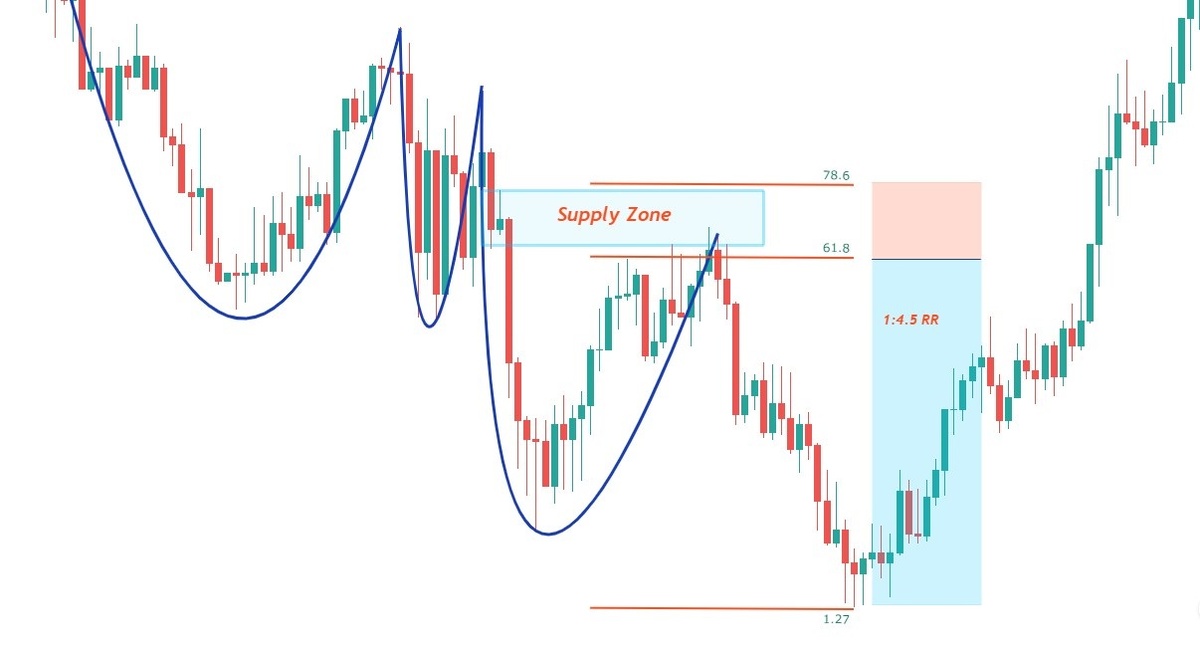 Использование уровней Фибоначчи в контексте спроса и предложения — основная тема статьи. Я объясню это на примере. Смотрите график ниже. В чистой среде наблюдаются колебания цены. Я нарисовал там зону предложения. Зона предложения находится на уровне 62,8 по Фибоначчи. Цена откатилась до уровня 61,8 по Фибоначчи. Только что коснулась зоны предложения, а затем оказалась в прибыли. На уровне предложения или уровне Фибоначчи мы будем искать пин-бар или свечу поглощения на любом более низком таймфрейме.