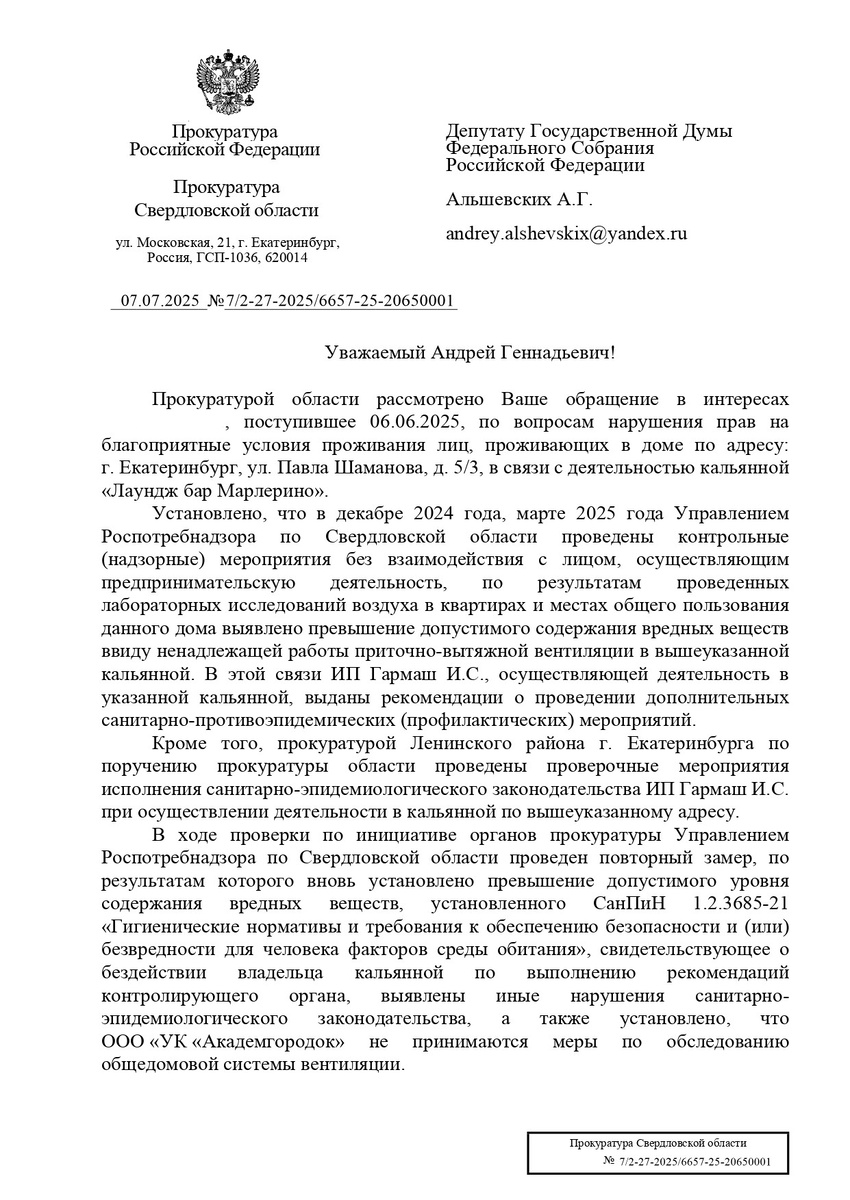 Возвращаюсь к истории из Академического. Здесь, в пристрое к многоэтажке на Павла Шаманова, 5/3, работает кальянная (ИП Гармаш И.С.). Время от времени дым из заведения распространяется по дому. Защищаю жителей, которые задыхаются в своих квартирах. Неоднократные проверки со стороны Роспотребнадзора и прокуратуры подтвердили превышение вредных веществ в воздухе. По-простому говоря, посетители «злачного» заведения травят окружающих. И раз ситуация не меняется месяцами, Роспотреб обратился в суд. Цель благая – признать деятельность ИП Гармаш И.С. незаконной и прекратить.