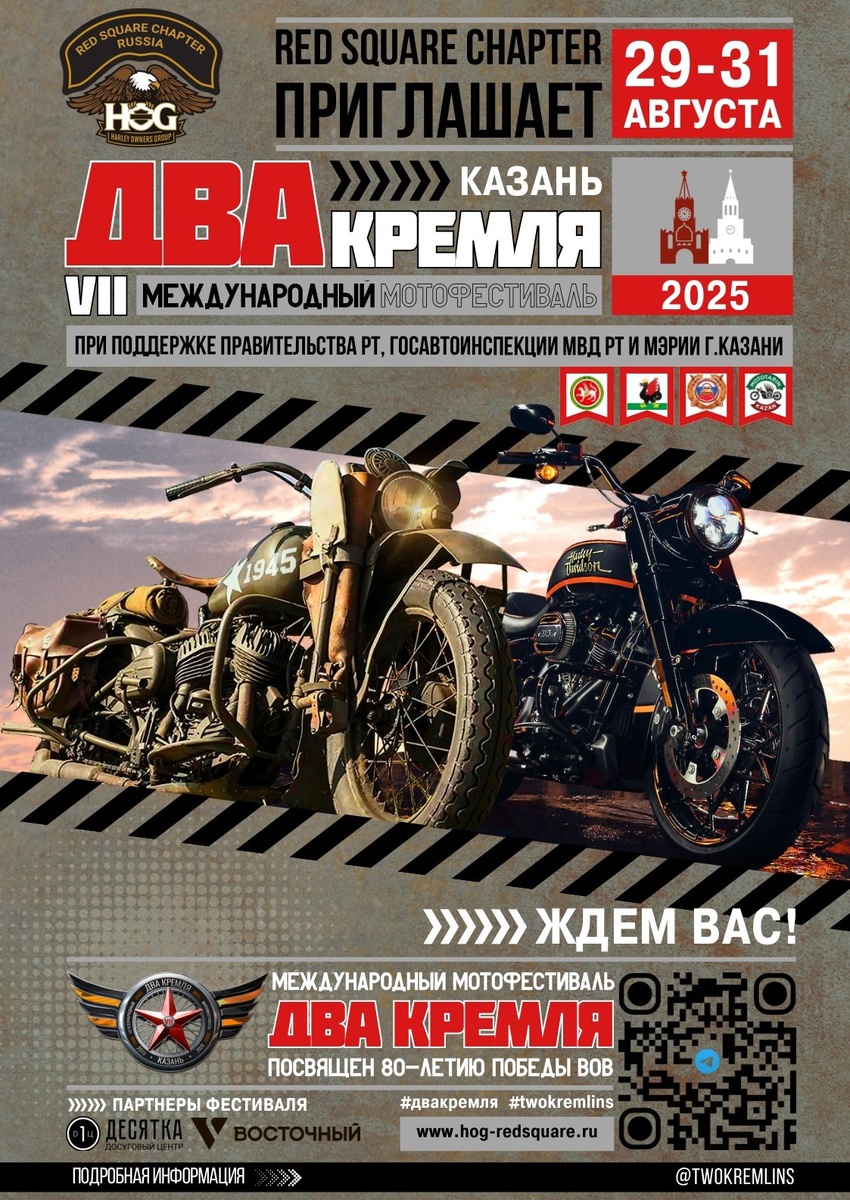 Приветствуем, друзья! Уже 30 августа Казань станет эпицентром мотоциклетной культуры на мотофестивале "Два Кремля", посвящённом 80-летию Победы!🔥 Не упустите шанс стать частью этого грандиозного события 🔥 🕒 30 августа 11:00 📍КАЗАНЬ, ПЛОЩАДЬ ДВОРЦА ЗЕМЛЕДЕЛЬЦЕВ 🎟Вход свободный 🔥 Вас ждет насыщенная программа: - Захватывающие мотошоу - Музыкальные выступления - Увлекательные мастер-классы и экскурсии - И многое другое! Стань частью истории! До встречи❤️🔥 #ДваКремля2025 #80летПобеды Motorcycle •[ЕКБ] МОТО• #мотосезон2025 #екатеринбург #ekbmoto #moto Источник