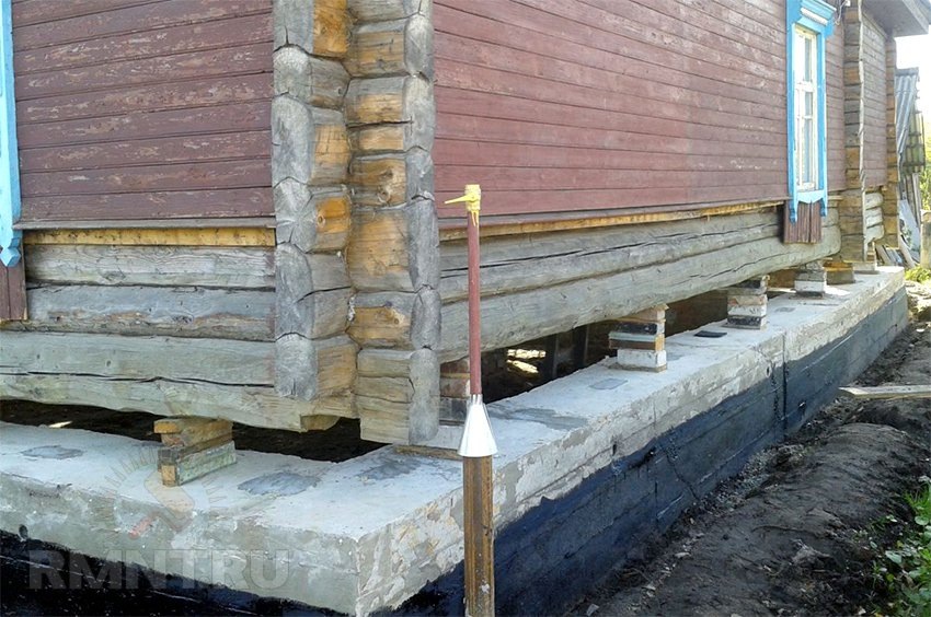 - После поднятия дома на домкратах под его стены необходимо завести опорную конструкцию (в случае со столбчатым фундаментом) либо подложить клинья (на ленточном) и оставить их на то время, пока будет продолжаться ремонт фундамента и его гидроизоляция, демонтаж повреждённых венцов и обработка дерева огнебиозащитой.