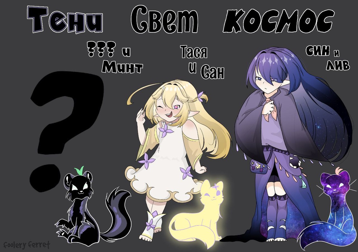 Помните ещё? Тени, свет, космос...да, там не только животные! ✨ У каждой команды есть два главаря (на данный момент, кроме теней) — человек и зверёк (кто-то из семейства куньих) 🌿 Помимо этих, да, есть ещё и другие. Конечно, у каждой команды, помимо главарей, есть остальные участники, если можно так сказать) Имеются не только тени, свет и космос, но и различные стихии, явления и др. (об этом вы узнаете позже))) Удивительно, что я уже дошла до того, что придумываю чуть ли не свои вселенные))) А теперь гадайте, как может выглядеть главный у теней)))