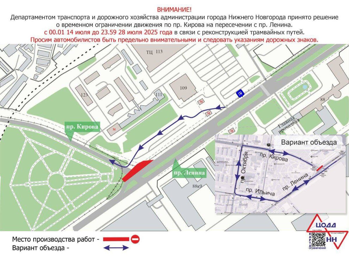 В Нижнем Новгороде с 14 июля до 28 июля временно приостановлен проезд транспорта по проспекту Кирова на пересечении с проспектом Ленина