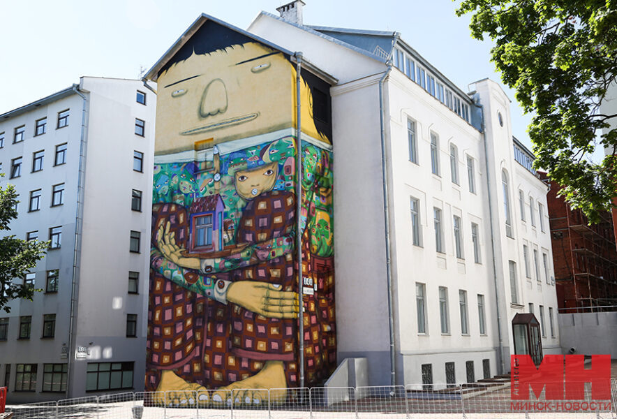 Космический Ярила, художник в одежде из керамической плитки и гигант, который сам себя обнимает. Где в столице находятся самые необычные муралы узнал корреспондент агентства «Минск-Новости».