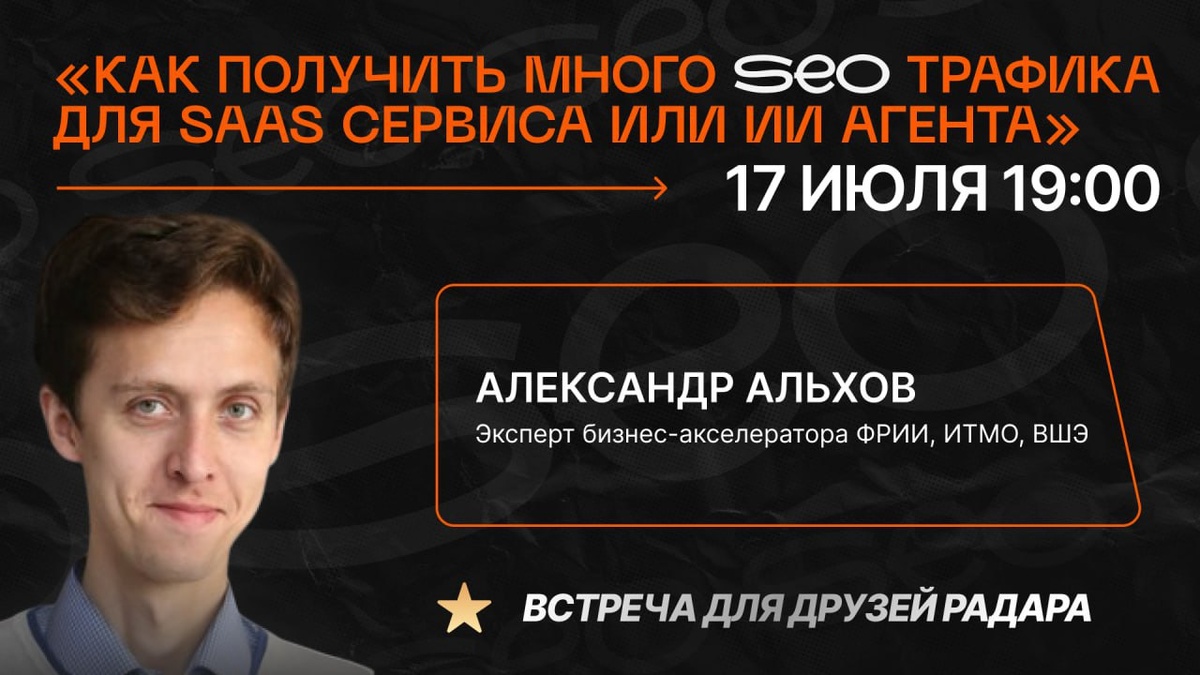 🔥Как получить много SEO трафика для SAAS-сервиса или ИИ агента? В этот четверг 17 июля, в 19:00 (МСК) — состоится третья тематическая встреча в сообществе Друзей Радара. Мы проводили встречи для Друзей на темы: ✔️Контент-маркетинг на Habr, Pikabu, Дзен и других площадках ✔️Привлечение инвестиций через крауд-платформы Теперь разберем SEO: Как сделать ваш стартап заметнее в новых реалиях и увеличить органический трафик клиентов. 🏅Спикер: Александр Альхов - Эксперт бизнес-акселератора ФРИИ, ИТМО, ВШЭ - Практик с опытом роста Edtech, HRtech и SaaS-проектов Где и как присоединиться? ⭐️ Закрытый чат Друзей Радара Попасть туда просто — достаточно поддержать площадку: ➡️ productradar.ru/friends/ Для кого встреча? 🟠Основатели SaaS и ИИ-стартапов 🟠Маркетологи, которые хотят прокачать SEO 🟠Все, кто ищет рабочие способы привлечь трафик без бюджета Прислать свой домен и пару ссылок на конкурентов, чтобы эксперт точечно дал совет именно вам➡️https://forms.gle/ThVk2qvtH5YnPLrb9 P.S. Что