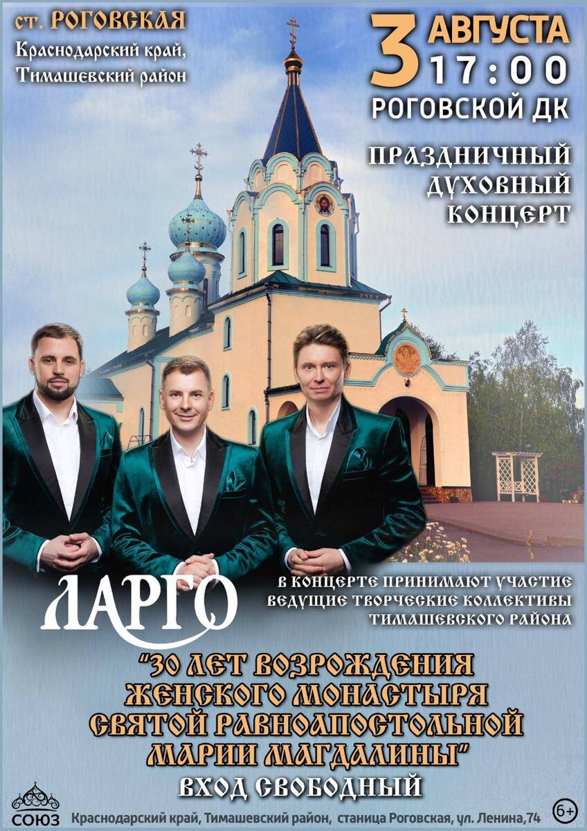 Дорогие! Мы счастливы сообщить, что 3 августа примем участие в прекрасном празднике! Краснодарский край, Тимашевский район, станица Роговская! Праздничный Духовный Концерт "30 ЛЕТ ВОЗРОЖДЕНИЯ ЖЕНСКОГО МОНАСТИРЯ СВЯТОЙ РАВНОАПОСТОЛЬНОЙ МАРИИ МАГДАЛИНЫ" Роговской Дом Культуры 17.00 ВХОД СВОБОДНЫЙ Обязательно посетите обитель и концерт! Будем ждать встречи! 🕊️🕊️🕊️
