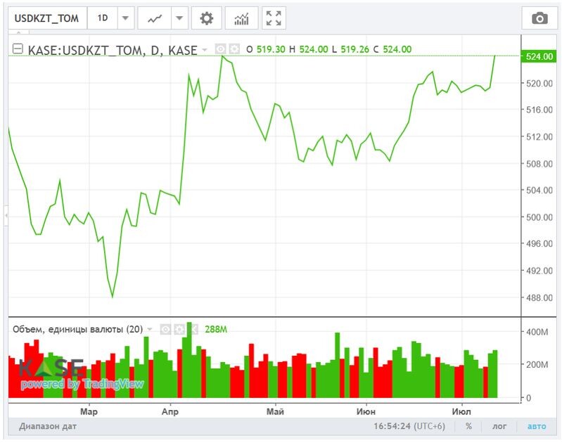 Обзор рынков подготовили аналитики Ассоциации финансистов Казахстана (АФК). Нацвалюта в пятницу возобновила падение на фоне сохраняющегося повышенного спроса на инвалюту внутри страны, несмотря на сохранение высокой базовой ставки. Так, по итогам валютных торгов 11 июля 2025 года курс USD/KZT вырос до отметки 521,31 тенге за доллар (+2,84 тенге). В то же время объём торгов составил 287,6 млн долларов (+17,8 млн). Отметим, что спрос на инвалюту внутри страны стимулируется в том числе реализацией крупных инфраструктурных проектов, требующих приобретения импортного оборудования, техники и лицензий. Сегодня в фокусе внимания – публикация данных о внутренней торговле. Диаграмма 1. Курс по паре USD/KZT: Источник: KASE Ставки денежного рынка показали небольшое разнонаправленное движение на фоне решения о сохранении базовой ставки НБРК. Так, ставка TONIA снизилась с 15,55% до 15,51%, в то время как доходность SWAP-1D выросла с 10,01% до 10,10%. Общий объём торгов увеличился до 448,2 млрд тенге
