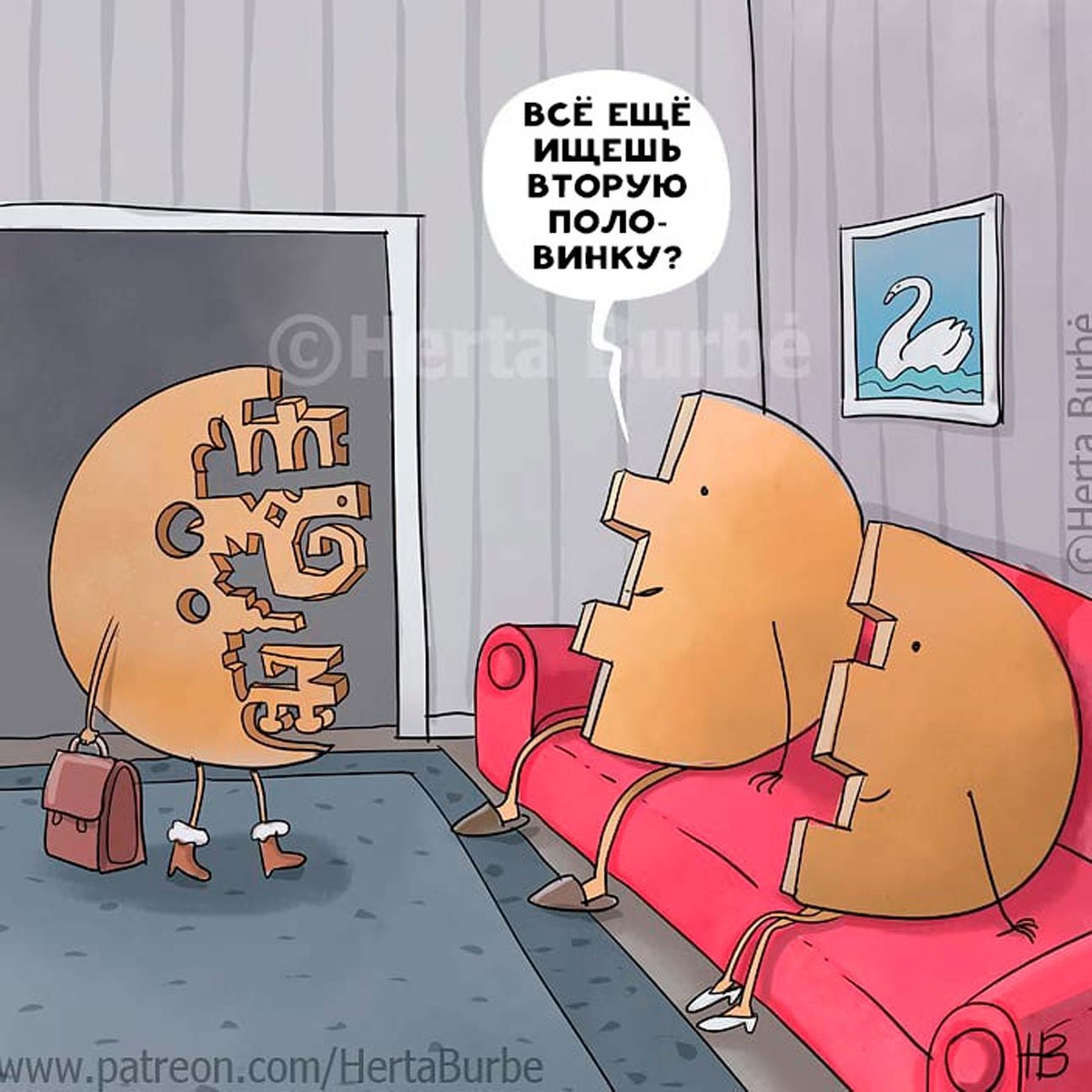 Человеку нужен человек – это истина, которую никто не оспаривает. Но найти сегодня «своего» человека сложнее, чем даже десяток лет назад. Мы все такие разные, что совпадения бывают очень редко, зато они идеальные. Художница из Литвы предлагает свои рецепты поиска половинок и делает это так душевно, изящно, что не дает даже возможности не поверить в себя и свое предназначение. Имя Герты Бурбе известно всем прибалтийским ребятишкам и их родителям. Иллюстратор, писательница, шутница – эта художница обожает хороший житейский юмор и фантазии. Когда-то очень давно Герта сделала важный шаг – нарисовала первый комикс и отправила его на конкурс. Художественная подача занимательных отношений между девочкой и котиком прославила Бурбе на всю страну. Комикс «Герта и Феликс» стал узнаваемым, приобрел популярность, а автор получила отличный задел на будущие успехи. Как человек искусства, Герта Бурбе не стала искать свою нишу в остросоциальных, злободневных тематиках. Ей ближе красота, причем даже в в