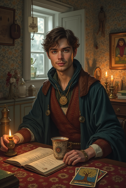 Его комната, затерянная на чердаке дома с фасадом цвета ванильного крема, напоминала гнездо алхимика. На полках стояли склянки с травами, собранными в полнолуние, на стене висел ковёр с вытканным Древом Жизни, а на столе, рядом с чашкой чая, вечно остывавшего из-за мечтаний, лежала колода Райдера-Уэйта. Карты пахли ладаном и тайной. «Великий Мастер…» — шептал Василиус, раскладывая карты для тренировки. Он представлял, как однажды клиенты будут платить ему не деньгами, а историями, а его имя станут шептать у колодцев, как легенду.