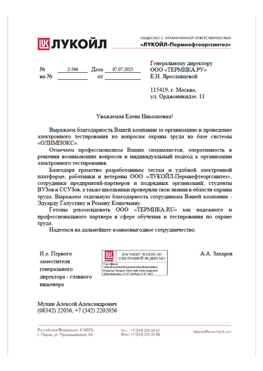 В адрес руководителя консалтинговой группы (КГ) «ТЕРМИКА» Елены Ярославцевой поступило письмо за подписью и. о. первого заместителя генерального директора – главного инженера ООО «ЛУКОЙЛ-Пермнефтеоргсинтез» Анатолия Захарова с благодарностью за организацию и проведение акции «Марафон безопасности», состоявшейся 28 апреля 2025 года в рамках Всемирного дня охраны труда. В рамках акции работники и ветераны компании, представители других предприятий и организаций, студенты и школьники стали участниками электронных соревнований на базе системы «ОЛИМПОКС», в ходе которых проверили уровень своих знаний по вопросам охраны труда. ООО «ЛУКОЙЛ-Пермнефтеоргсинтез» – одно из ведущих нефтеперерабатывающих предприятий России, с которым КГ «ТЕРМИКА» сотрудничает около 10 лет. В компании установлены системы «ОЛИМПОКС:Предприятие» и «ОЛИМПОКС:Инструктаж». Об успешном опыте применения этих продуктов специалисты предприятия рассказали в Перми на конференции «Современные инструменты цифрового обучения перс