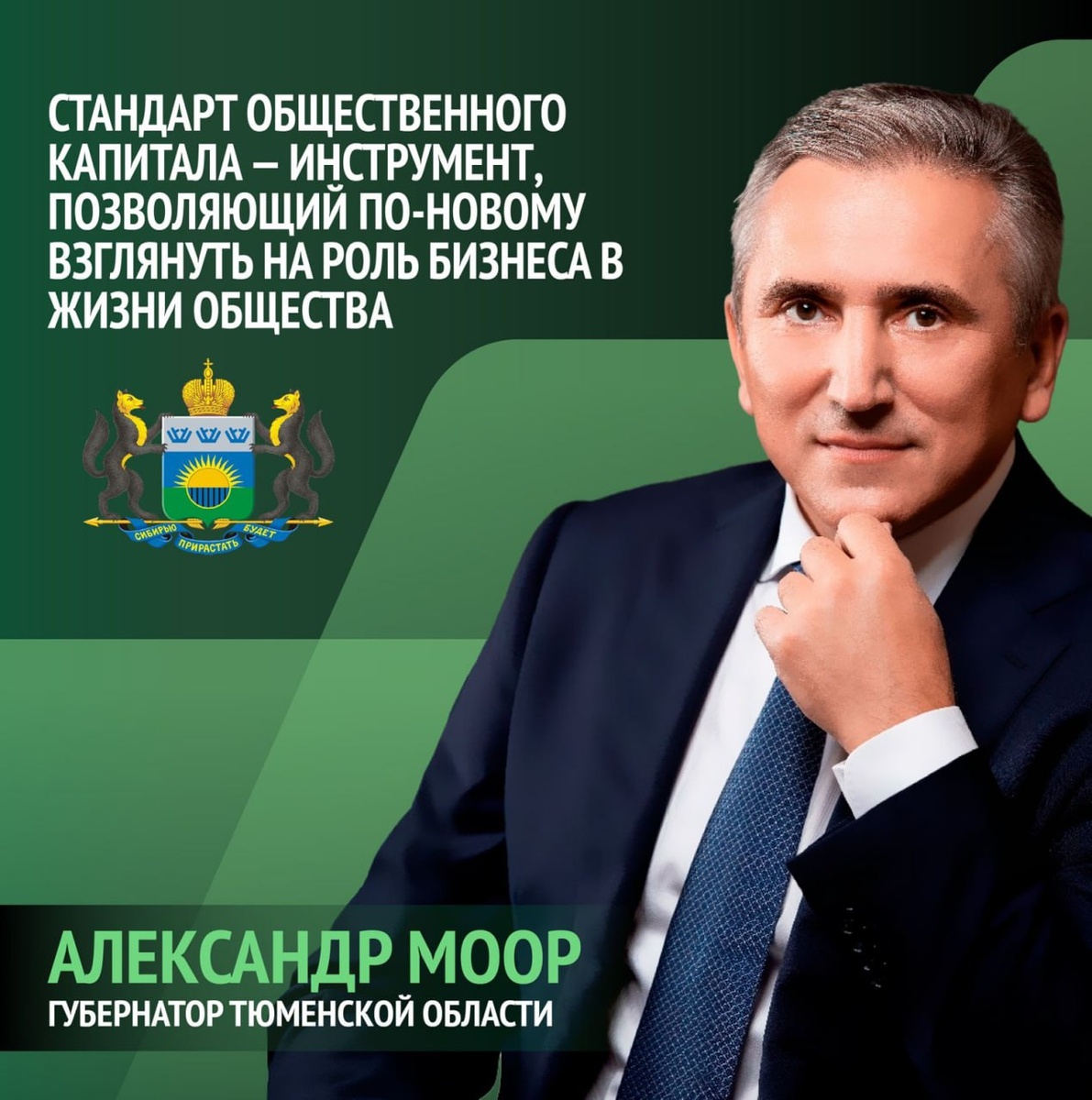 Губернатор Тюменской области Александр Моор: «Стандарт общественного капитала — инструмент, позволяющий по-новому взглянуть на роль бизнеса в жизни общества. Он помогает оценить, насколько активно предприятия участвуют в развитии территории и насколько значим их вклад в решение социальных задач. Уверенность в том, что внедрение стандарта даст дополнительный импульс развитию партнёрских инициатив и привлечению инвестиций в социальную сферу, подтверждена практикой. Это путь к устойчивому развитию региона, в котором выигрывают все»