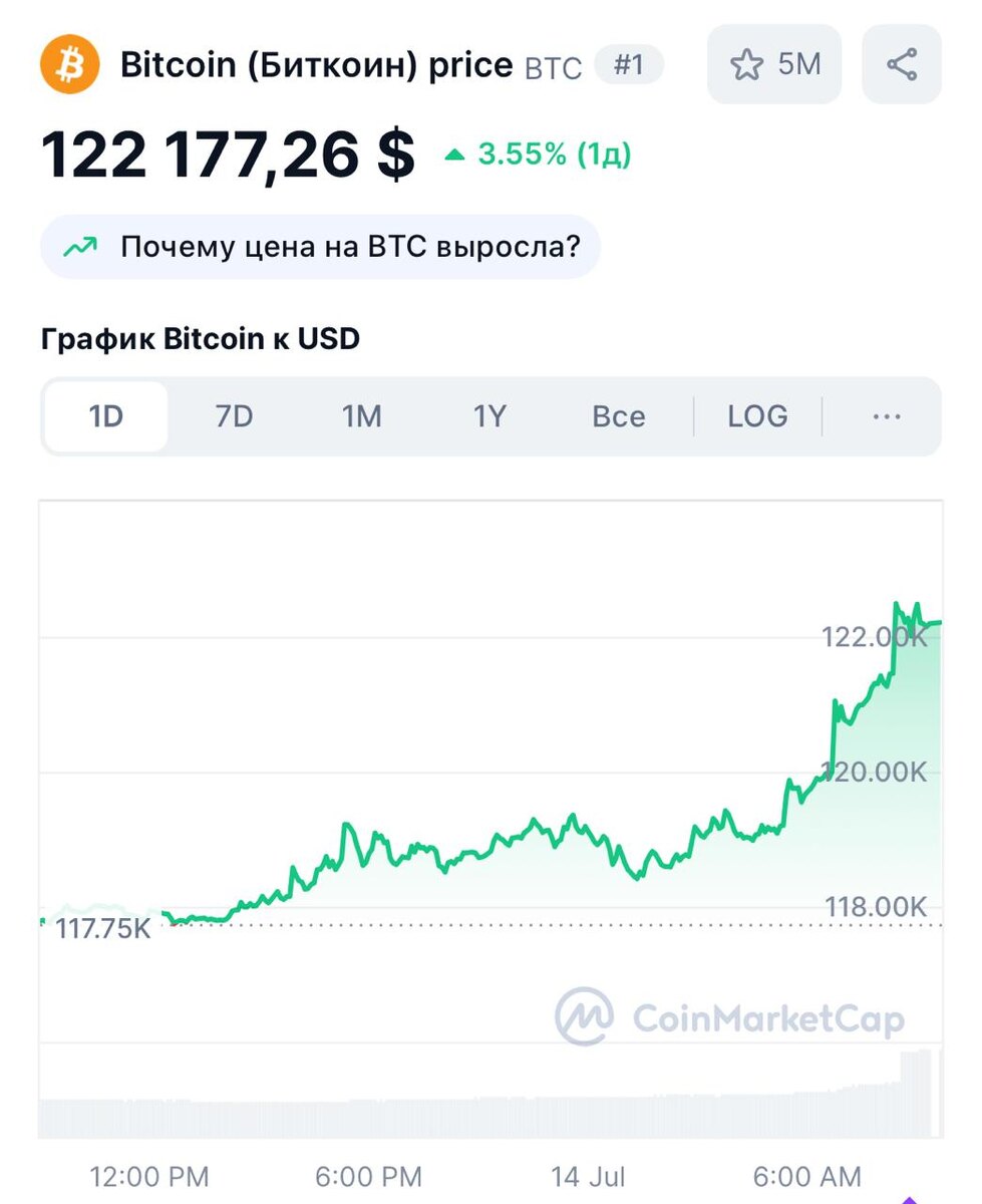 Биткоин достиг отметки $122 тыс. — это новый исторический рекорд.