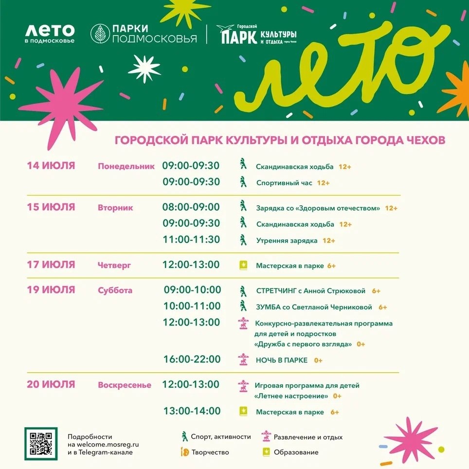 ✨ Мероприятия на этой неделе в Городском парке 👉Для вас много мероприятий: Скандинавская ходьба, зарядка, мастерская, зумба и многое другое. А самое главное, ждём В СУББОТУ с 16:00 до 22:00 НА ФЕСТИВАЛЬ - "НОЧЬ В ПАРКЕ" 🌛 🚫 Возраст: 0+ 🏢 Городской парк культуры и отдыха 📍 г. Чехов, ул. Пушкина, д.1 🪙 Вход свободный❗️ ⭐Разместить публикацию ⭐Поддержать канал голосом #webЧехов ✅ Мероприятия Чехов https://dzen.ru/id/66cc4b48e9ef144699238a51 http://vk.com/chekhov_events http://dzen.ru/chekhov_events