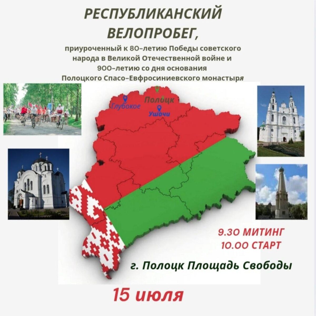 Республиканский патриотический🇧🇾 велопробег🚴♂️ стартует из Витебской области по Беларуси Маршрут пройдет по территории Беларуси, символическим образом соединяя между собой Брестскую, Витебскую, Гродненскую и Минскую области. Старт велопробега в древнем Полоцке будет дан 1️⃣5️⃣ июля с площади Свободы и завершится 1️⃣9️⃣ июля в Минске у храма-памятника Всех Святых. ☝️Участники акции посетят знаковые места и памятники Великой Отечественной войны. ✅В программе мероприятий организаторы велопробега, а это Министерство спорта и туризма, Белорусская православная церковь, уполномоченные по делам религий и национальностей, облисполкомы и райисполкомы, предусмотрели митинги, возложения цветов, благословение участников, молебны, обзорные экскурсии и культурные мероприятия.