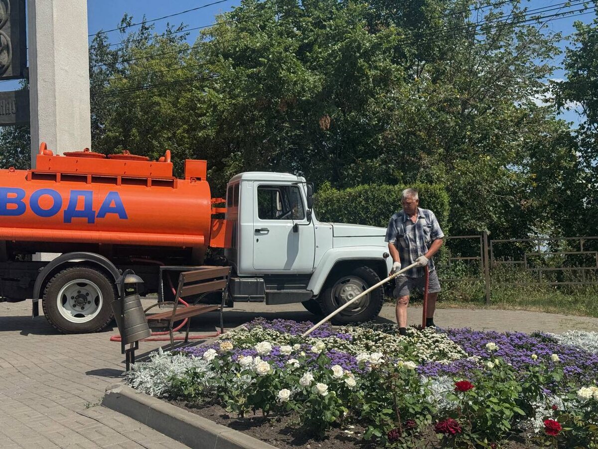 Специалисты тщательно поливают деревья и цветочные клумбы, обеспечивая оптимальный уровень влажности почвы, что способствует здоровому развитию молодых саженцев и сохраняет их жизнеспособность.