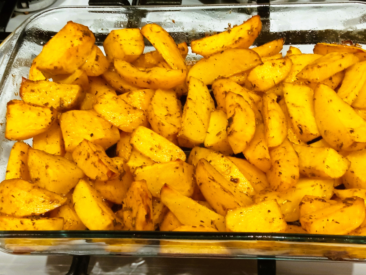 Картошка по-деревенски – это простой, сытный и очень вкусный гарнир, который отлично сочетается с мясом, рыбой или овощами. Готовится быстро, а результат всегда радует! ✔ 4–5 средних картофелин ✔ 2–3 ст. л. растительного масла ✔ 2–3 зубчика чеснока (по желанию) ✔ Куркума ✔ Соль, перец – по вкусу ✔ Паприка, сушеные травы (прованские, базилик, укроп, тимьян) 2. Заправка: В отдельной небольшой миске смешайте все ингредиенты для заправки: масло растительное, соль, перец молотый, чеснок в мелкую терку и сухие травы-приправы: укроп, прованские, тимьян, куркума. Растительное масло выбирайте любое (без запаха, оливковое или с ароматом семечек (нерафинированное)). Куркума придаст картошке цвет зажаристости. Кто то любит добавлять измельченный суповой кубик. В нем есть все: и вкус и соль и цвет. Сухие травы добавляйте по своему вкусу. Я очень люблю тимьян. Добавляю его во все овощные и мясные рецепты. 😋 3. Смеши