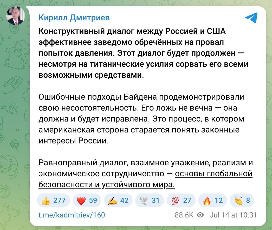 Давление США на Россию «обречено на провал» - Кремль Давление США на Россию «обречено на провал», а стороны должны продолжить "конструктивный диалог". Об этом заявил спецпредставитель президента РФ Кирилл Дмитриев на фоне ожиданий анонсированного заявления Трампа "Конструктивный диалог между Россией и США эффективнее заведомо обречённых на провал попыток давления. Этот диалог будет продолжен — несмотря на титанические усилия сорвать его всеми возможными средствами. Ошибочные подходы Байдена продемонстрировали свою несостоятельность. Его ложь не вечна — она должна и будет исправлена. Это процесс, в котором американская сторона старается понять законные интересы России. Равноправный диалог, взаимное уважение, реализм и экономическое сотрудничество — основы глобальной безопасности и устойчивого мира" , - написал Дмитриев. Ранее СМИ писали, что Трамп может сегодня объявить о новом пакете вооружений для Киева, который будет включать ракеты большой дальности.