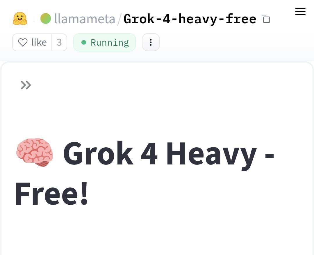 Grok 4 Heavy теперь можно использовать бесплатно ИИ за 300 долларов в месяц залили на Hugging Face. Heavy получил режим мышления и прокачанный список возможностей, которых нет в базовой версии. Пользуемся здесь. CtrlAltDelights- подписаться