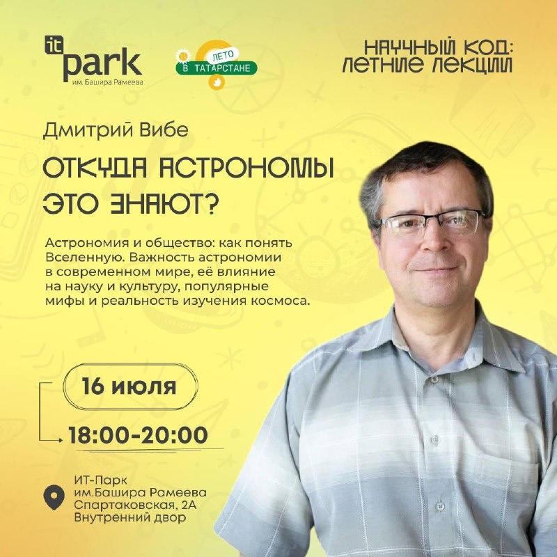 ☀️ Лекции ИТ-парка снова погружают нас в научно-космическое пространство! В эту среду, 16 июля, в 18:00 собираемся во внутреннем дворике ИТ-парка им. Башира Рамеева. Вместе с Дмитрием Вибе послушаем звездную лекцию на тему: «Откуда астрономы это знают?» Дмитрий Вибе — российский астроном и популяризатор науки, доктор физико-математических наук, заведующий отделом физики и эволюции звёзд Института астрономии РАН, профессор РАН. ➡️ Поговорим про то, зачем вообще люди столько времени смотрят в небо, как открываются тайны Вселенной, и почему астрономия — это не только про телескопы. Вход также свободный, а регистрация по ссылке! 📌Вспомнить как прошлая прошлая лекция с Ильей Мириным и найти фото можно здесь! До встречи на космической лекции!