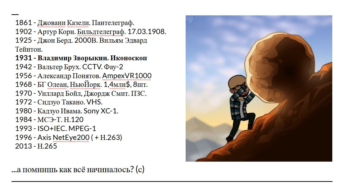 🥸 Ты точно знаешь, когда появилась первая камера? А кто заплатил за 8 камер 1.4 миллиона долларов в 1968-м и зачем? 😳 Видеонаблюдение - это не просто железки, софт и монтаж. Это живая история, полная инженерных прозрений, дорогостоящих провалов и героев, про которых не всегда пишут в учебниках. И как ни странно, именно история отрасли может стать отличным тренажёром для спикеров и лучшей подсказкой для тех, кто работает в СБ сегодня на многочисленные вопросы - почему? 🤔 Потому что технологии меняются, а логика ошибок - нет. 😝 Потому что всё новое - это либо забытое старое, либо плохо понятое прошлое. 😎 Потому что, изучая путь развития отрасли, ты учишься принимать решения быстрее, увереннее и без паники. 🤫 Я начинаю цикл коротких (наверное) постов про эволюцию видеонаблюдения от пантелеграфа (а может и от наскальной живописи) до H.266 и систем с нейросетями. Будем разбираться, почему Зворыкин опередил время, как изобрели VHS и кто первый вложился в “умные” камеры. 🫡 Подпи
