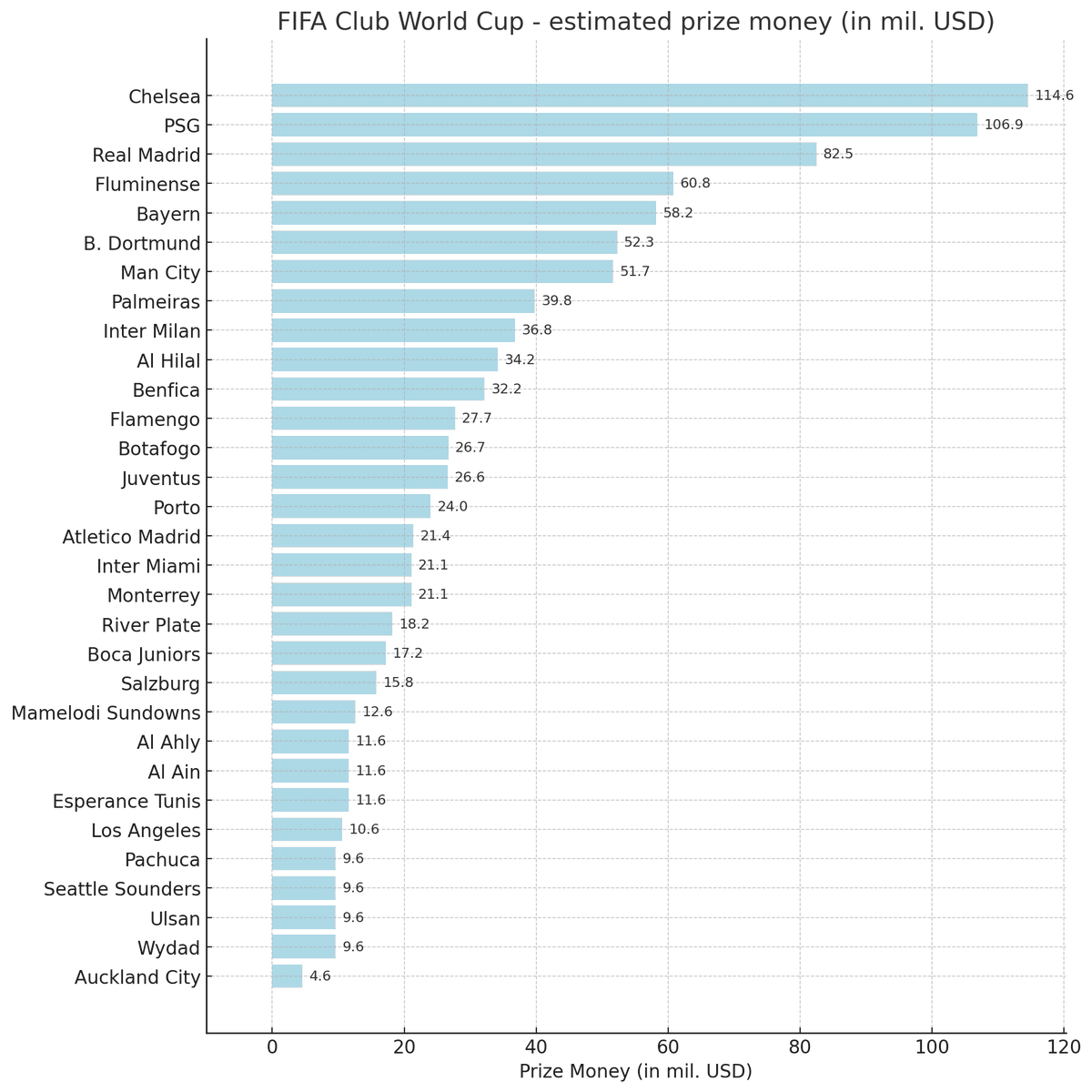 Вот и подошел к концу первый клубный чемпионат мира. Победитель довольно неожиданный – «Челси». Но пока значимость этого трофея находится в стадии принятия, можно с точностью сказать, что у клубов есть мотивация побеждать. Точно, деньги. И в сливочном масле, помимо мадридского «Реала», купаются не только финалисты турнира. Призовые клубов за КЧМ: 1. «Челси» ($114,5 млн); 2. «ПСЖ» ($106,9 млн); 3. «Реал Мадрид» ($82,5 млн); 4. «Флуминенсе» ($60,8 млн); 5. «Бавария Мюнхен» ($58,2 млн); 6. «Боруссия Дортмунд» ($52,3 млн); 7. «Манчестер Сити» ($51,7 млн). Полный список👇 Может, лучше остальной год не играть?