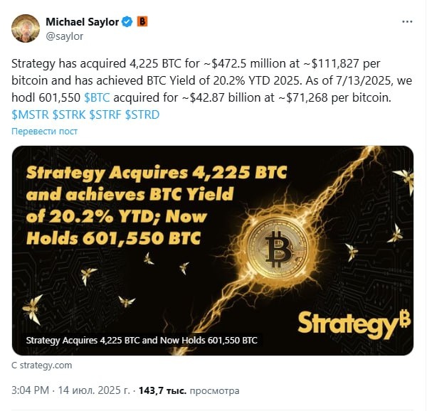 πΈΠΠΎΠΌΠΏΠ°Π½ΠΈΡ Strategy ΠΊΡΠΏΠΈΠ»Π° 4225 BTC, ΡΠ΅ΠΏΠ΅ΡΡ Π½Π° Π΅Ρ Π±Π°Π»Π°Π½ΡΠ΅ 601550 BTC ($73,1 ΠΌΠ»ΡΠ΄