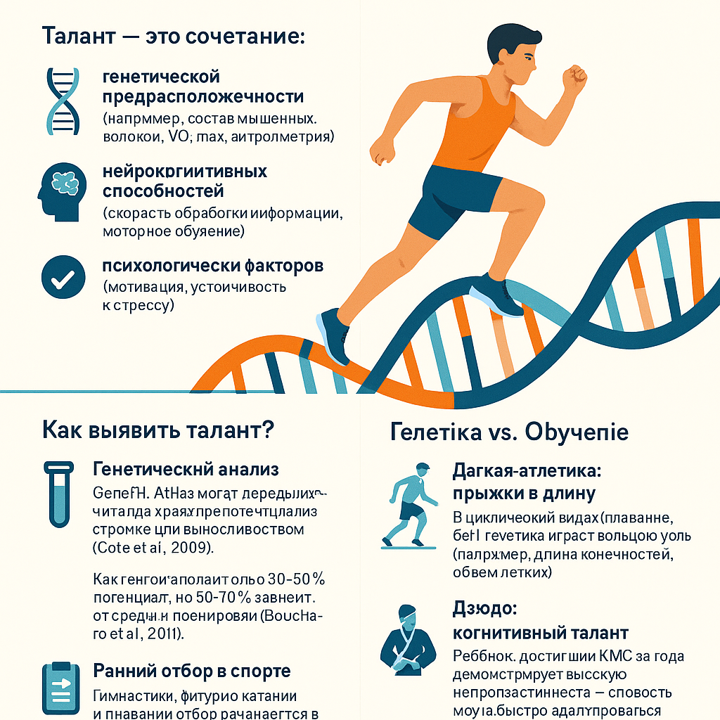Во всех видах спорта талант проявляется по-разному, но его природа остаётся предметом научных дискуссий. Что же такое талант? Согласно современным исследованиям, талант — это сочетание: Талант в спорте — это комплексный феномен, где генетика задаёт базу, а тренировки и когнитивные способности определяют успех. Современные методы (ДНК-тесты, функциональные тесты) помогают выявить потенциал, но без правильного развития даже лучшие задатки останутся нереализованными. Однако есть исключения из правил. К примеру, Месси — главный талант этого столетия, а Роналду — это упорство и труд. У Месси папа был футболистом, а у Роналду — нет. Месси бегал с животиком и забивал много мячей, а вся карьера Роналду — это тренировки, самодисциплина в питании, сне и восстановлении.