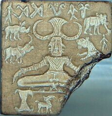 Наиболее известным из хараппских йогических изображений является «печать Пашупати»[16], обнаруженная британским археологом Джоном Маршаллом, который полагал, что на ней изображена одна из древних форм Шивы[17]. Некоторые учёные, однако, подвергают сомнению идею того, что изображённый на печати «Пашупати» («Господь животных»)[18] представляет фигуру Шивы или Рудры[19][20][21].