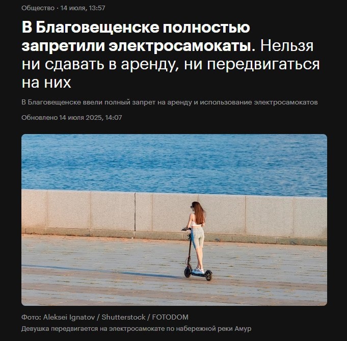 Электросамокаты в России начали убирать под корень — первый пошёл Благовещенск. Теперь там не только нельзя кататься на электросамокатах, но и сдавать их в аренду. За попытку — штраф до сотки. Официальная причина — забота о безопасности, но на деле просто возвращают нас в эпоху пеших прогулок. Говорят, что и в других городах могут закрутить гайки. Привыкаем ходить ножками 😱 Подробнее: https://hard-tm.su/threads/101581/ 🕹HARD-TM — Подписаться