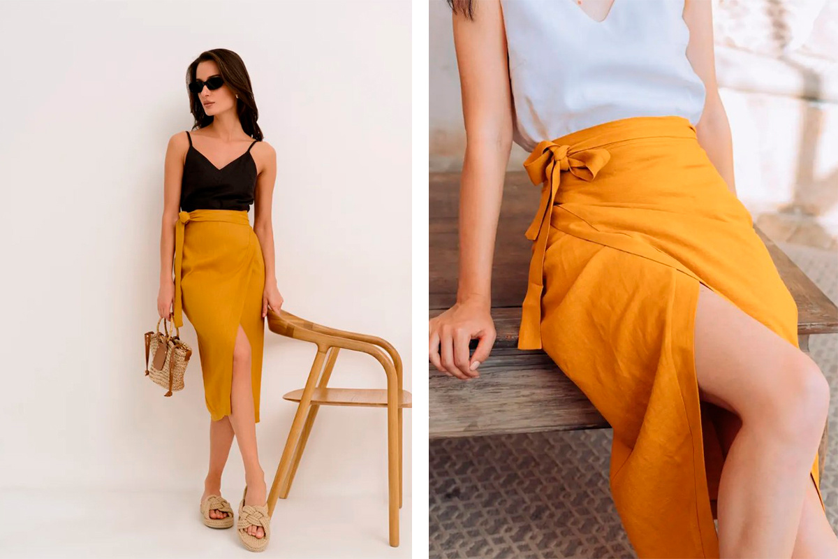 Легкая, женственная и очень удобная юбка. Сшита из льна с вискозой, хорошо держит форму, но при этом мягкая и приятная к телу. Запах регулируется завязками, так что можно подстроить под фигуру. Высокая посадка визуально вытягивает силуэт. Подходит под топы, рубашки и даже футболки. Отличный вариант и на пляж, и на свидание, и в офис — универсальная находка на лето.
