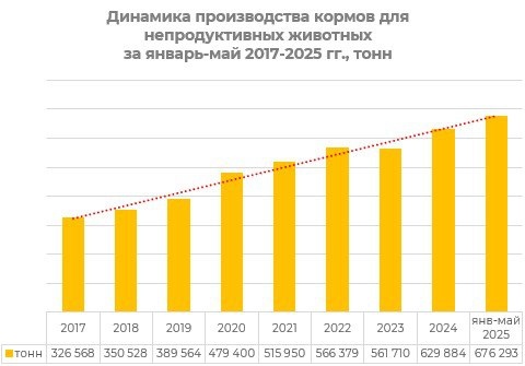 За январь-май 2025г. объем производства кормов для непродуктивных животных составил 676,3 тыс. тонн, что на 7,4% (или на 46,4 тыс. тонн) больше показателя аналогичного периода прошлого года.