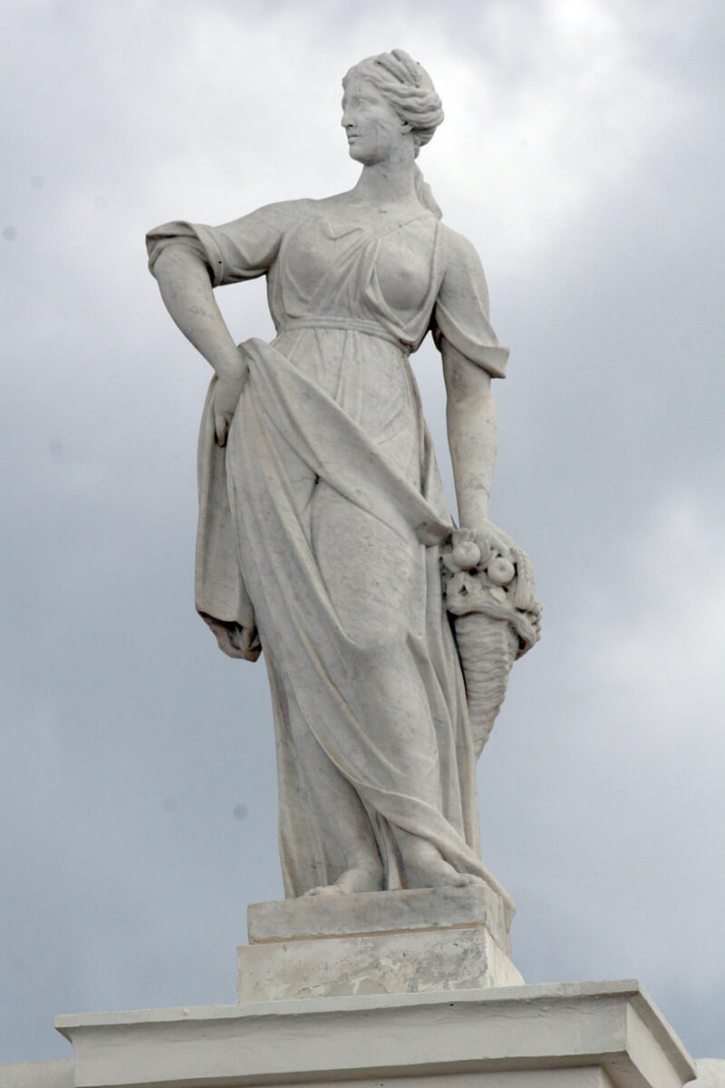 Одна из центральных женских мраморных фигур на балюстраде нижней террасы Архангельского — Аллегория Плодородия с изогнутым и повернутым вверх рогом изобилия, наполненным цветами, плодами и фруктами. Прославляя изобилие природы и земли, статуя имеет аллегорический смысл, сближающий созерцание скульптуры в садах усадьбы с чтением книги, изучением особого языка. Прелесть аллегории («говорить иначе») под открытым небом в отсутствии слов, но при этом в возможности увидеть, разгадать вкус, убеждения владельца и оценить задуманное. Античная мифология предлагает несколько объяснений происхождения символа рога изобилия. Одно из самых известных связано с рождением и воспитанием младенца Юпитера (греч. Зевса), которого пришлось прятать от его кровожадного отца Кроноса. В другом мифе рог изобилия был связан с подвигом Геркулеса (греч. Геракла) во время сватовства к Деянире. Герой вступил в единоборство с речным богом Ахелоем, принявшим образ быка