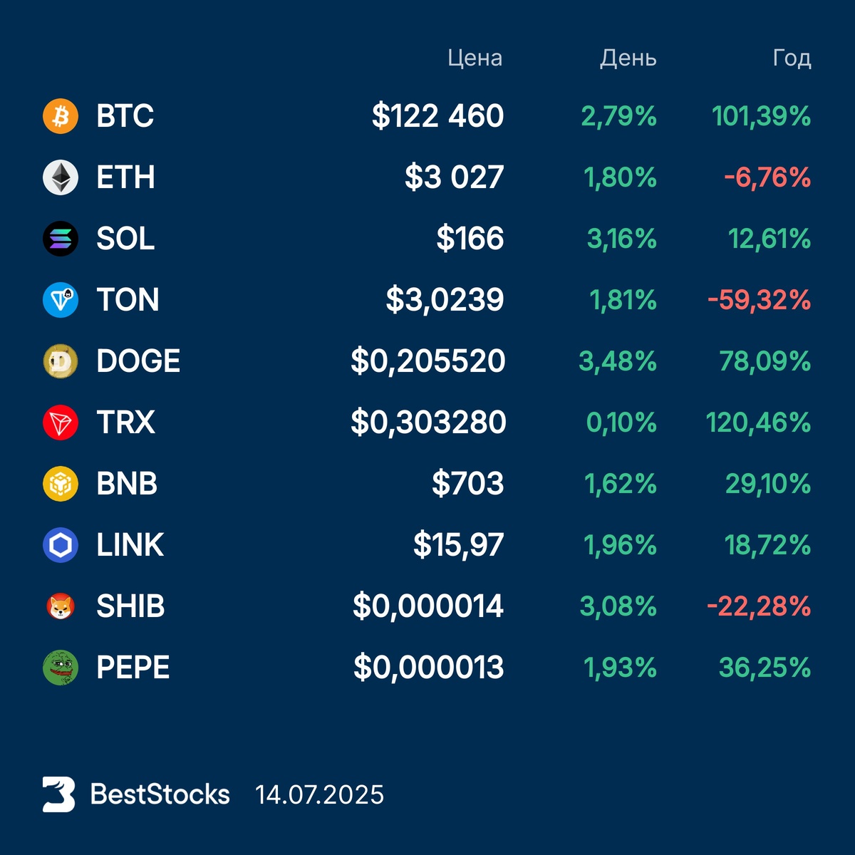 Курсы основных криптовалют: Bitcoin, Etherium, Solana, Toncoin, Dogecoin, TRON, BNB, Chainlink, Pepe, Shiba Inu на текущий момент #крипта #crypto #курс #BTC #ETH #SOL #TON #DOGE #TRX #BNB #LINKUSD #PEPEUSD #SHIBUSD ••••• 🆕 Новая фича на сайте — Тепловая карта рынка. Вы можете оценить динамику рынка в моменте: какие акции больше всего растут или падают, какие торгуются больше других. Всё это бесплатно и доступно без регистрации. Пользуйтесь!