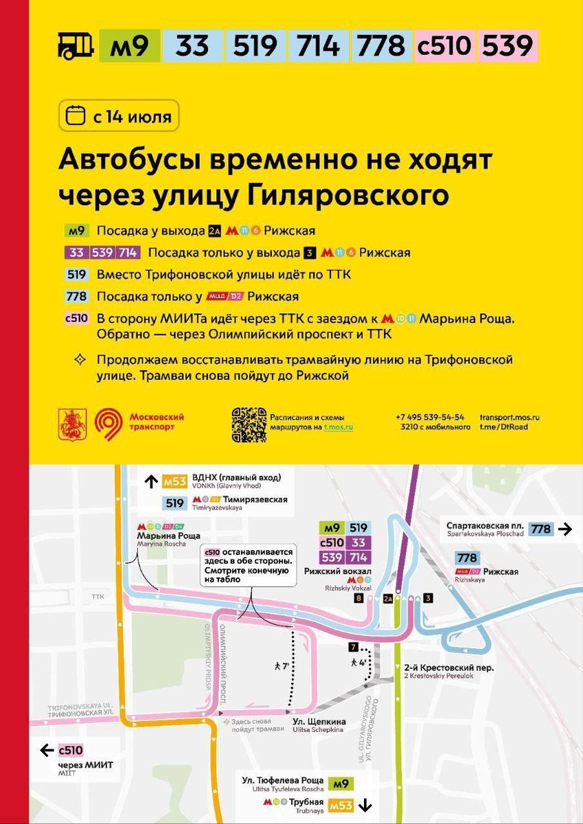 Уважаемые жители❗️ 🚫 В связи с проведением строительных работ с 14 июля до 10 августа участки улиц Гиляровского, Трифоновской, а также бокового проезда Новорижской эстакады будут закрыты для движения. 🛑 С 14 июля будет временно ограничено движение автобусов по улице Гиляровского. Ознакомиться с изменениями можно на схеме. Учитывайте предстоящие ограничения и планируйте свои маршруты заранее!