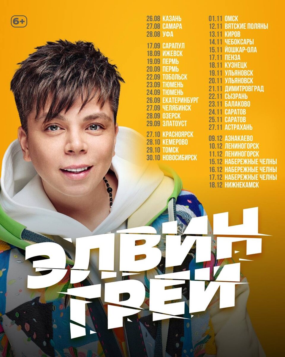 ТУР 2025-2026🚀 Это будет горячо, мощно и незабываемо! Десятки городов, сотни людей и тысячи эмоций ждут в этом сезоне! Ещё больше света и звука, ещё больше ярких впечатлений, новинок, любимых песен и бесконечного драйва и огня! Это будет жаркий сезон🔥 До встречи, друзья! 🎫 Билеты уже в продаже на сайте elvingrey.ru и vipart-ufa.ru #элвингрей #elvingrey