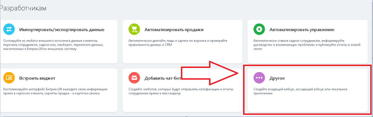 Задание: для задач с опеределенным названием, например, MissedCall +7901******* необходимо автоматически менять поле Проект на Пропущенные звонки (ID 555). Но в настройках роботов задачах это поле не отображается для настройки. Перейдите в раздел «Разработчикам —> Другое —> Входящий вебхук» в вашем Битриксе. В настройках вебхука